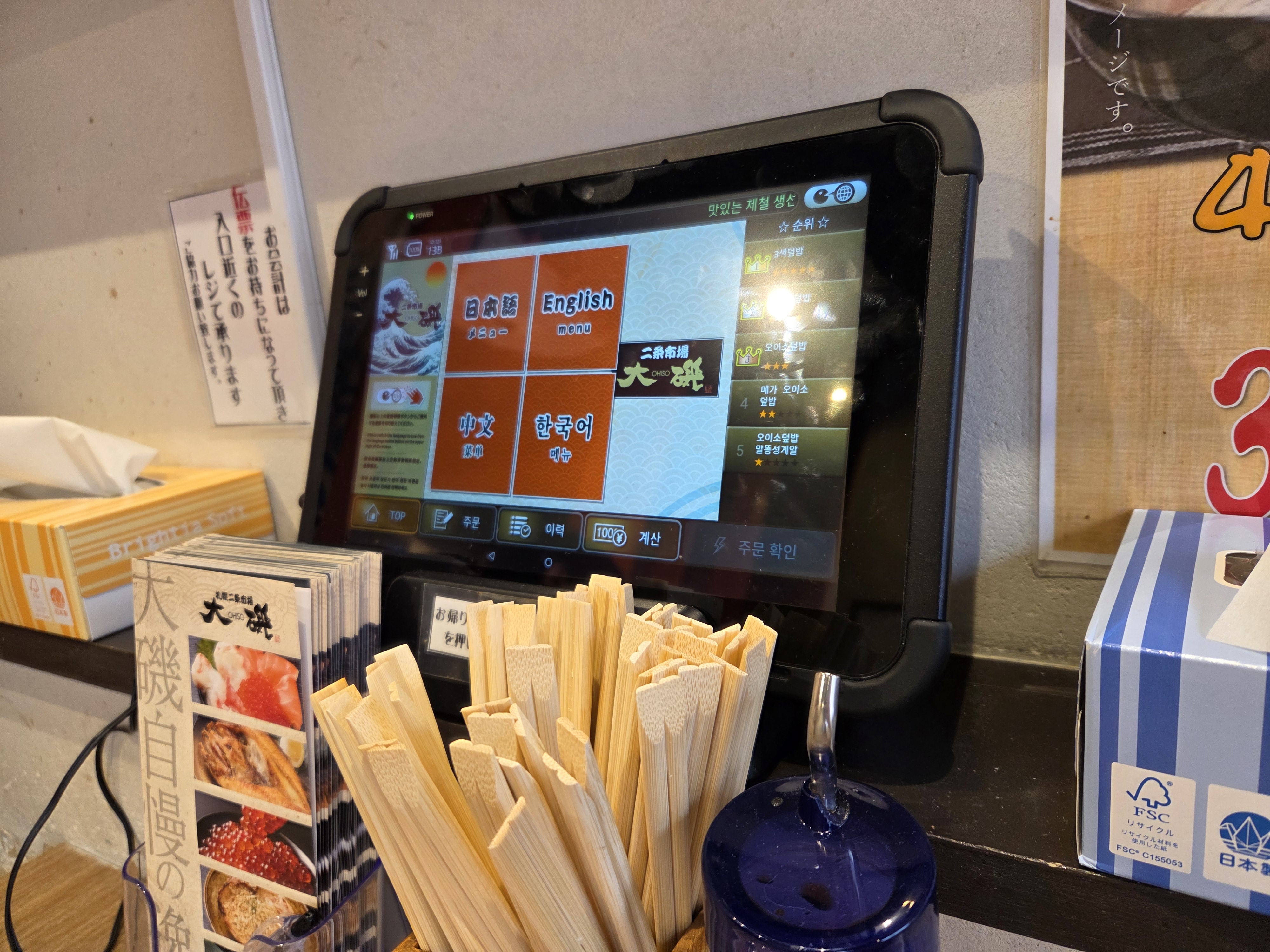 주문을 태블릿으로 하는 시스템이었는데 한국어가 눈에 뜨였어요~ 주문을 편하게 할 수 있어서 좋았습니다.