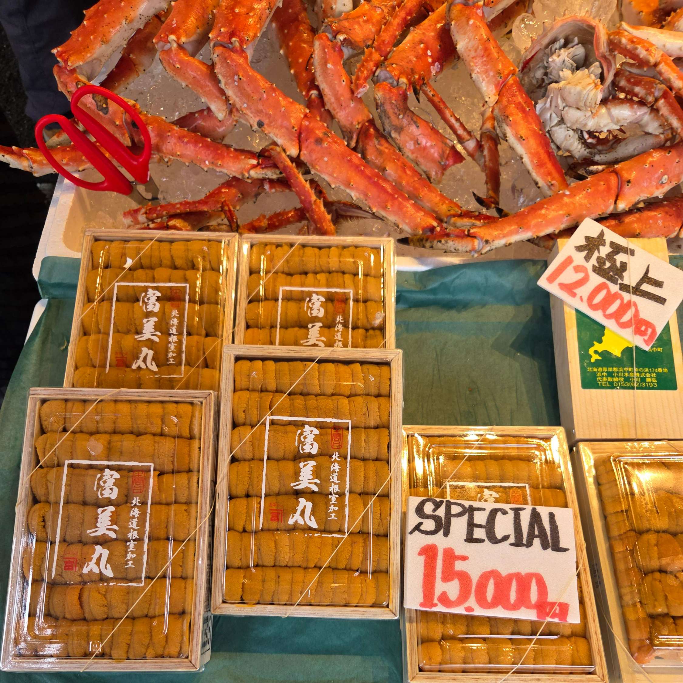 왼쪽에는 니조시장에서 팔고 있는 우니들이고 오른쪽은 저희가 시킨 우니였습니다. 생각보다 양이 작긴 했지만 우니 퀄리티가 굉장히 좋아 보여서 너무 맛있을 것 같았습니다. (가격은 많이 비쌌고요.)