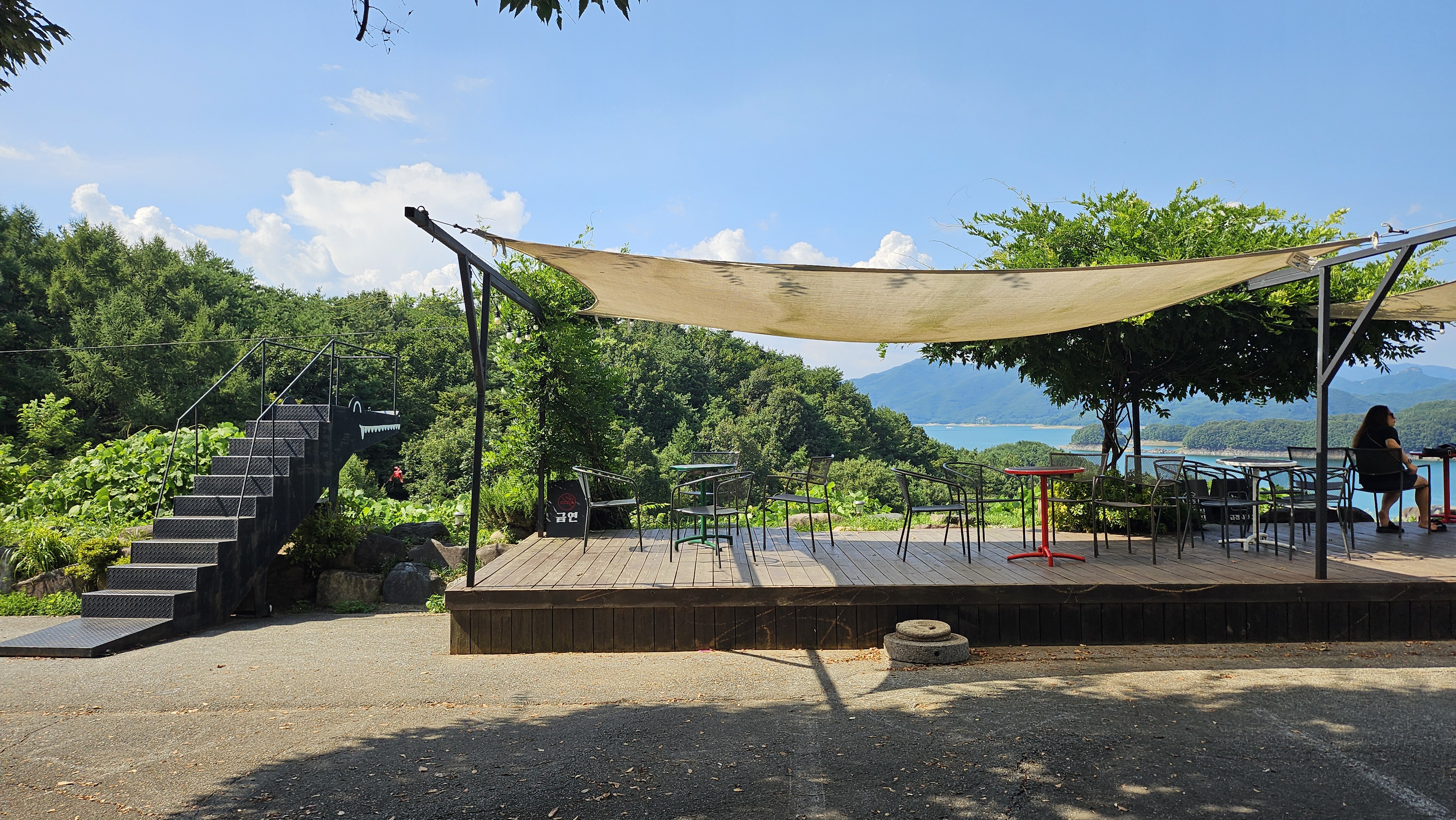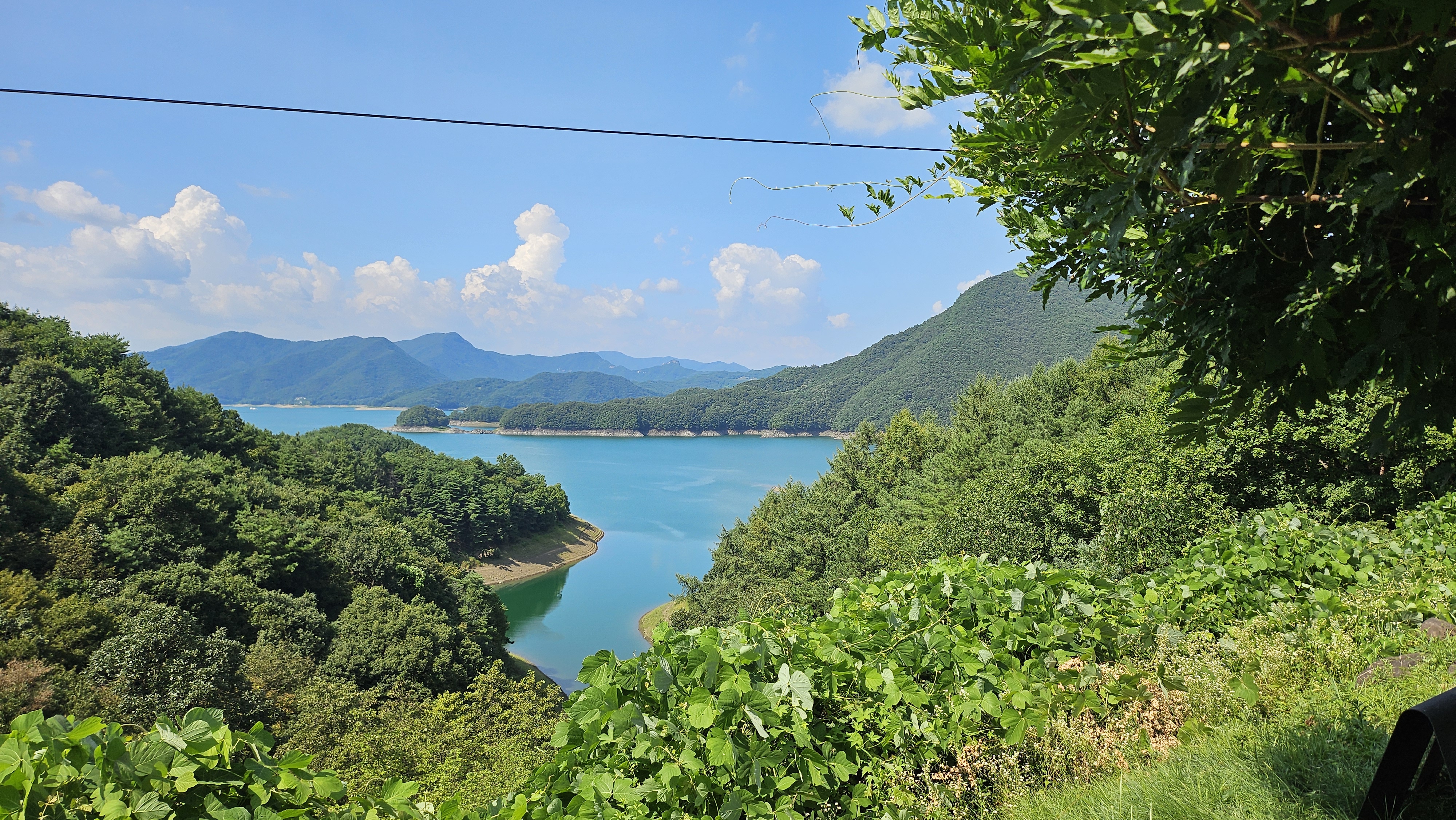 도착한 게으른 악어에서 바라본 충주호의 모습입니다. 여름에는 정말 무덥긴 하지만 사진 하나만큼은 정말 청량한 느낌으로 나와주는 것 같아 덥더라도 꼭 사진을 찍으려고 노력하는 편입니다.