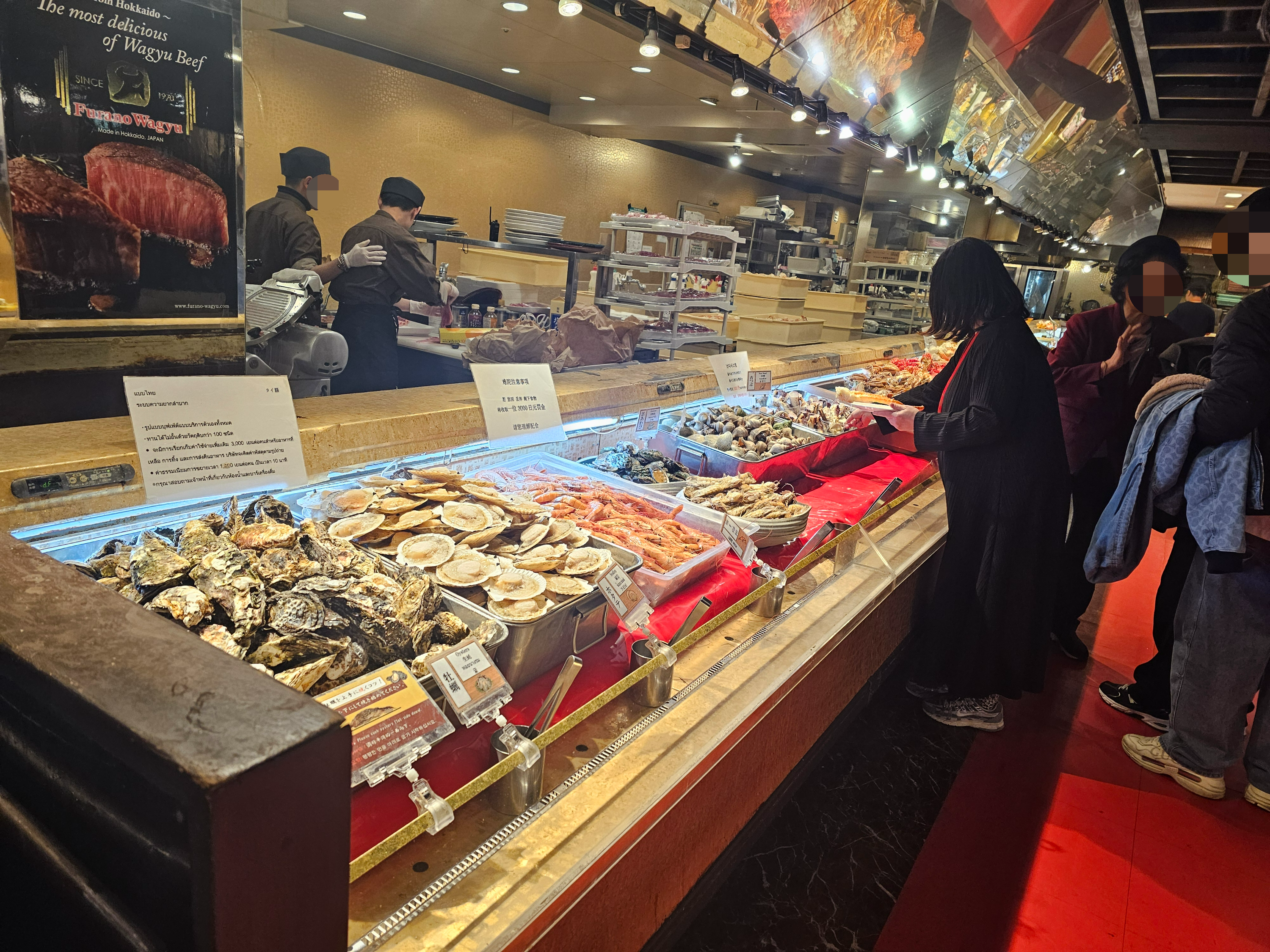 이렇게 반조리를 해놓은 것도 있고 생물인 상태도 있는데 준비되어 있는 해산물을 가져가서 구워 먹는 시스템입니다. 반조리해 놓은 건 금방 익긴 하나 수분이 거의 없어 살이 퍼석한 느낌이 많았고요. 생물은 상대적으로 맛있는데 조리시간이 오래 걸렸습니다.